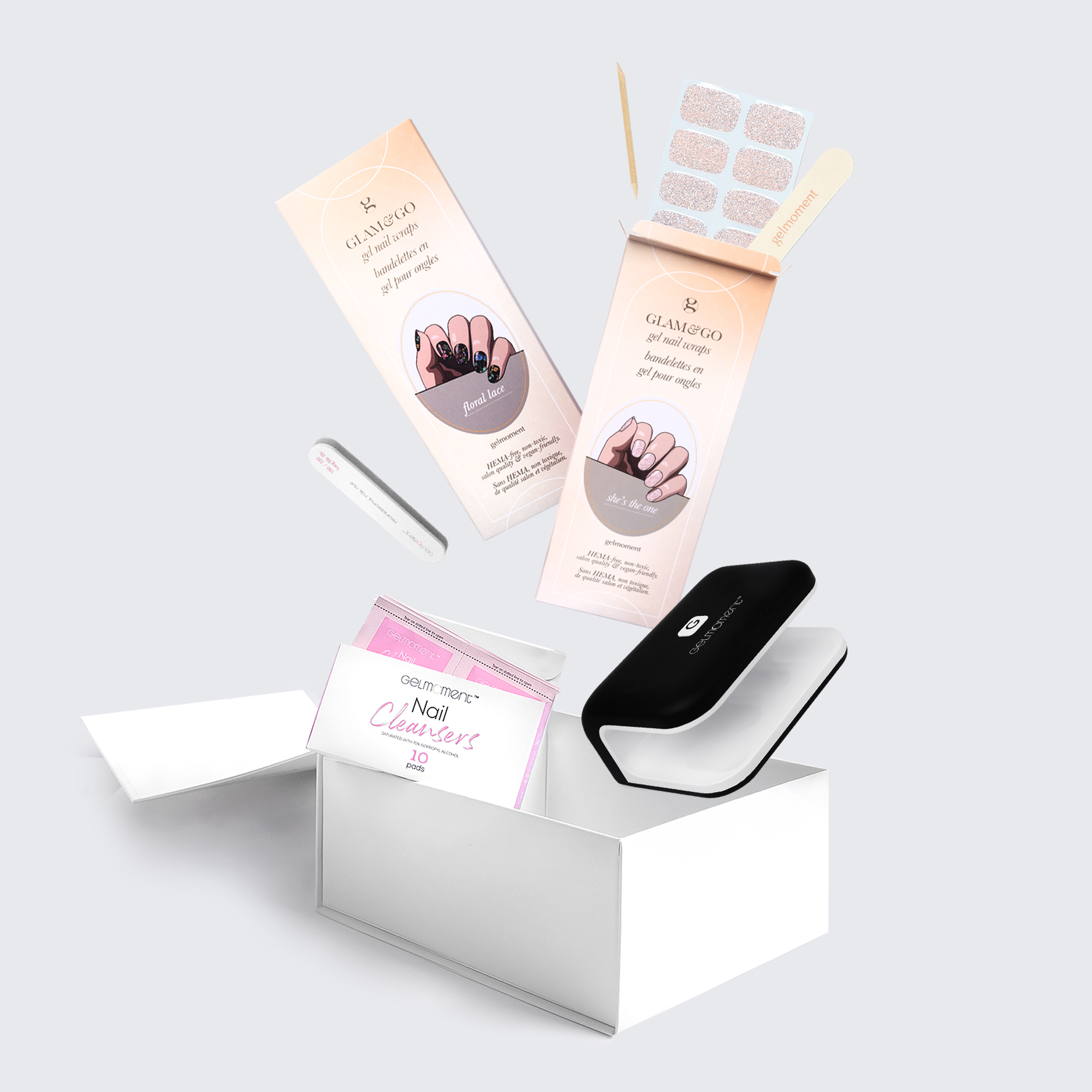 Gelmoment glam & go gel nail wraps are convenient, easy to use, and glamorous. Our 2 customer kit options contain all the essential products you need to try them out and experience it for yourself: A beautiful DIY gel manicure really is as simple as glam & go.