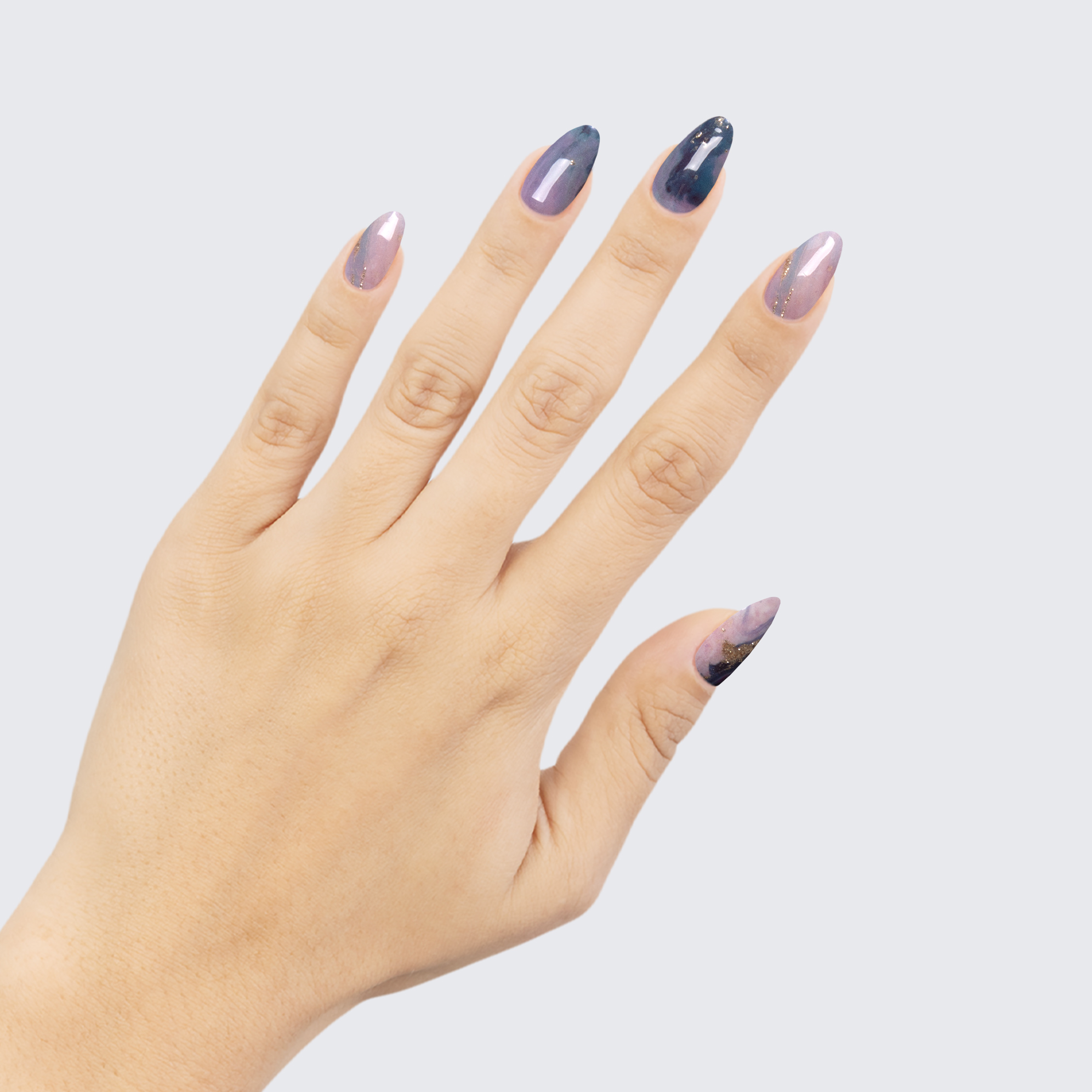 Marble swirl pattern of navy, aqua, and pastel blue, with varying shades of pink, purple, fuchsia, and white. Gold glitter accents. Semi-transparent. Mixed undertones.
